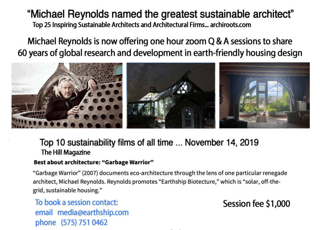 Michael Reynolds will give several lectures and tours of the newest Earthships & construction sites.