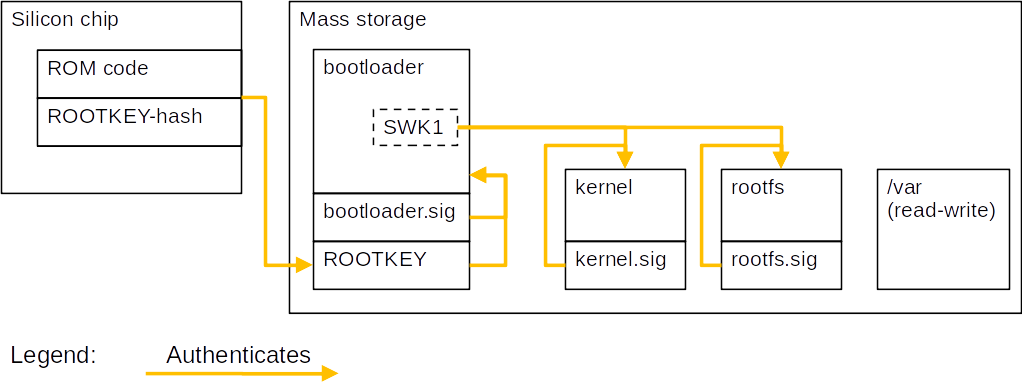 Secure Boot establishes a chain of trust that starts from the ROM code, extends through the bootloader, kernel, and finally the root filesystem.