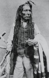 Chief Poundmaker (Pihtokahanapiwiyin) was born in the Battleford region around 1842 and raised by Cree relatives. As a young adult, he was adopted by Chief Crowfoot, a Blackfoot, thereby creating family ties between two nations. Poundmaker was proficient as a herbalist and a healer, an ability perhaps inherited from his father Sikakwayan, a well-known Assiniboine medicine man. Poundmaker’s mother was a mixed-blood Cree, sister of Chief Mistawasis. Poundmaker received his name because of his expertise in building and utilizing pounds for hunting buffalo. Shortly after signing Treaty 6 he became chief of 182 people, who settled on a reserve about forty miles west of Battleford. He quickly established himself as a fine orator, speaking out against the failure of the federal government to live up to treaty commitments. Poundmaker was not against the concept of the treaties, but he wanted a treaty that would make sense to his people. He wanted respect shown to his people, and provisions that they would need in times of famine. In 1885 Poundmaker, members of his band, and members from nearby bands traveled to Battleford to ask for rations. When they arrived at the village they found the community deserted and helped themselves to some supplies. In response, Lieutenant-Colonel William Otter and 325 troops were sent to Cut Knife Creek, where Poundmaker and his Cree followers were encamped. On May 2 a battle occurred, and Otter was forced to withdraw, with Poundmaker stepping in to prevent further bloodshed. When Poundmaker heard of Riel’s defeat at Batoche, he traveled there and surrendered his arms; he was immediately imprisoned. Poundmaker was tried and convicted of treason in Regina, and sentenced to serve three years at Stony Mountain Penitentiary (Manitoba). To avoid angering his powerful father, Chief Crowfoot, Poundmaker’s hair was not cut and he served only seven months of his sentence. Even though his prison time had been shortened, it destroyed his health, and while visiting Chief Crowfoot in 1886 (shortly after his release) he suffered a lung hemorrhage and died at the age of 44. On October 13, 1972, a plaque commemorating Poundmaker was unveiled by Jimmy Poundmaker, his grandson, at the Cut Knife battlefield site on the Poundmaker Reserve.
