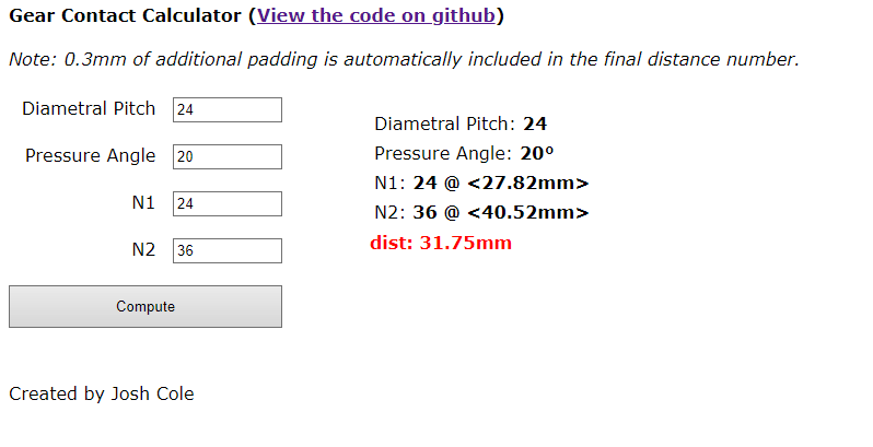 Gear Contact Calculator06/15/2020 at 05:08 • 0 commentsI threw together a super simple gear contact and size calculator. Input gear details, output is distance to space them from each other (and size of gear, evaluated as dp + 2*a): https://sharpcoder.github.io/gear-utils/
