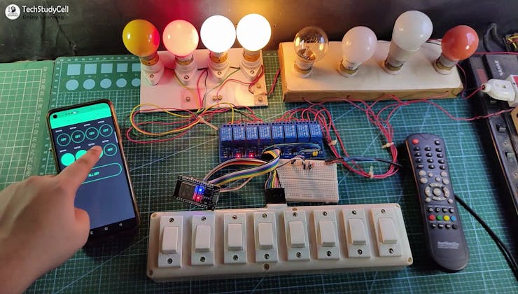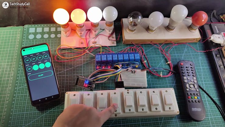 In this IoT project, I have shown how to make IoT-based ESP32 Home Automation using Blynk, IR remote, and switches to control an 8-channel relay module with and without internet. If the internet is not available, then you can control the home appliances from IR remote & manual switches.
