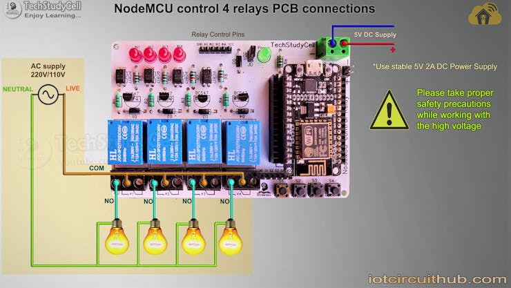 Connect the 4 appliances with the relay module as per the circuit diagram.