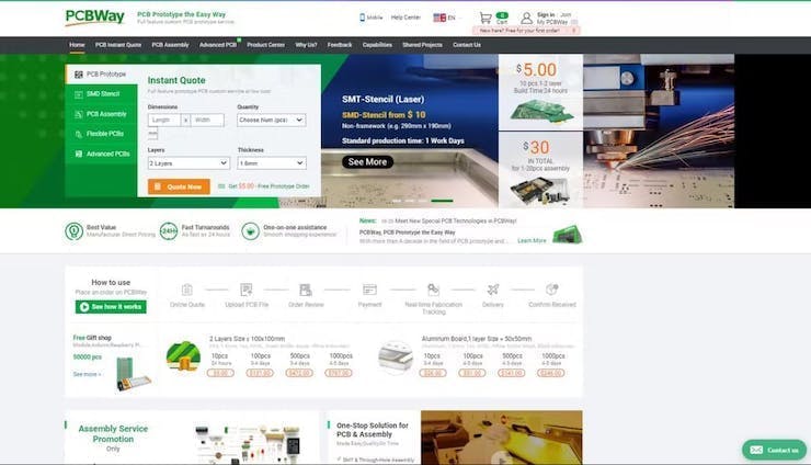 You get 10 good-quality PCBs manufactured and shipped to your doorstep for cheap. You will also get a discount on shipping on your first order. Upload your Gerber files onto PCBWAY to get them manufactured with good quality and quick turnaround time. PCBWay now could provide a complete product solution, from design to enclosure production. Check out their online Gerber viewer function. With reward points, you can get free stuff from their gift shop.