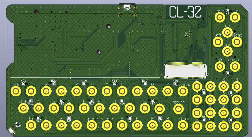 The main PCB gains an i2c battery fuel gauge to get round some silly analog read issues i was having, and that free's up a pin for some 'neopixel' backlight led's for the keyboard. These are a little power hungry, so I have made them switchable. There have been a few other tweaks, the keyboard has had a shuffle, the m.2 socket has moved to allow some navigation buttons to be available up at the top right for easy access