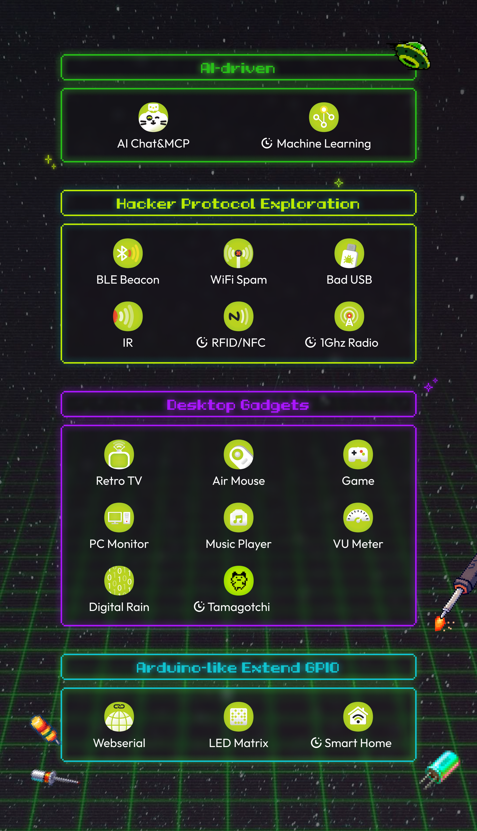 So I sketched this device on paper: a pocket-sized all-in-one body, with a sturdy CNC-6061 metal loop, built-in display, transparent BSP drivers, and a multi-app launcher. Ready to use out of the box, it supports AI conversations and MCP control, protocol hacking, DIY hardware extensions, desktop gadgets, an open-source SDK, and much more.