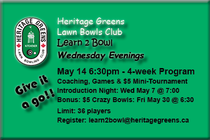 Heritage Greens Lawn Bowling Club is located Kitchener, Ontario in Rosenberg Park at 600 Heritage Drive. Our facilities are right behind Lyle Hallman Pool. Relocated from Rockway in 1997 we have two full sized greens with many leagues and jitneys for members.