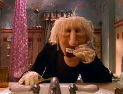 The puppet's design appears to be reworked from an old lady puppet that was used as part of Geri and the Atrics on The Muppet Show. The puppet would be reverted back into an old lady for Muppets Haunted Mansion as Miss Cartier.