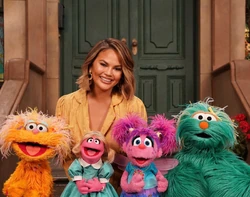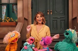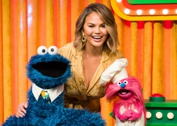 Teigen has appeared with her husband John Legend at the Sesame Workshop Benefit Gala in 2010 and 2019, and filmed Sesame Street segments for Episode 5011 in November 2018. She posed on-set for promotional photos (by Richard Termine) with Zoe, Prairie Dawn, Abby Cadabby, and Rosita.