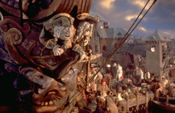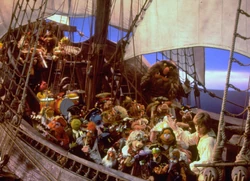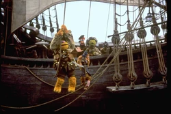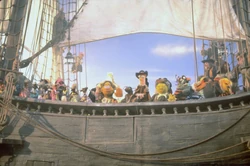 Jim, Gonzo, and Rizzo arrive in Portsmouth where they seek out Squire Trelawney who examines the treasure map, and he agrees to fund a voyage to locate the treasure. The group, accompanied by Dr. Livesey, his assistant Beaker and Mr. Bimbo, the man who lives in the squire's finger, go to the dock and board the galleon, The Hispaniola. Jim and his friends meet the cook, Long John Silver, the first mate Mr. Arrow, and finally Captain Abraham Smollett. The ship sets out, with a host of bizarre crew members and several songs to go with them. Three pirates attempt to convince Rizzo and Gonzo to tell them where the map is by torturing them, but they are locked in the brig. This event prompts Smollett to lock the map in his safe. Silver tricks Mr. Arrow into leaving the ship in a lifeboat, and gains his keys, allowing his friends to steal the map.