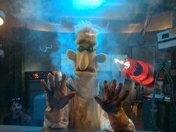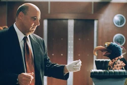 While Kermit and his friends refuse to believe his wild ravings, Gonzo is lured into the clutches of K. Edgar Singer (Jeffrey Tambor), a government agent who has also taken note of the aliens' attempts at communication and believes that Gonzo is his key to convincing his superiors that aliens do in fact exist. Kermit and the gang spring into action to rescue Gonzo, with the help of some handy inventions courtesy of Dr. Bunsen Honeydew and Beaker.
