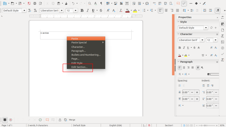 - New "Edit Section" UNO command which works if cursor is in a section, has been created and added in context menu. tdf#102132 (Gülşah Köse).