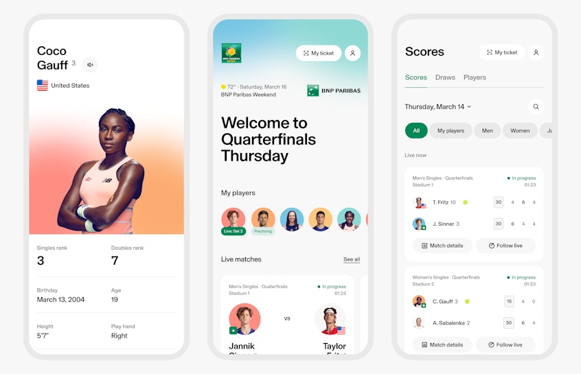 The mobile app is the go-to companion for anyone on-site at the Indian Wells Tennis Garden, with dining information and menus for the more than 20 food and beverage options; real-time notifications for activities happening around the grounds, as well as daily practice schedules.