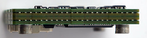 This is one of the more over-engineered solutions I’ve seen. I’m guessing that the middle layer of the three-layer stack is probably hollowed out, such that the surrounding boards create a Faraday cage. This would allow sensitive ECG front-end circuitry to be placed inside a shielded “container” that also doubles as a connector between the front and back boards.