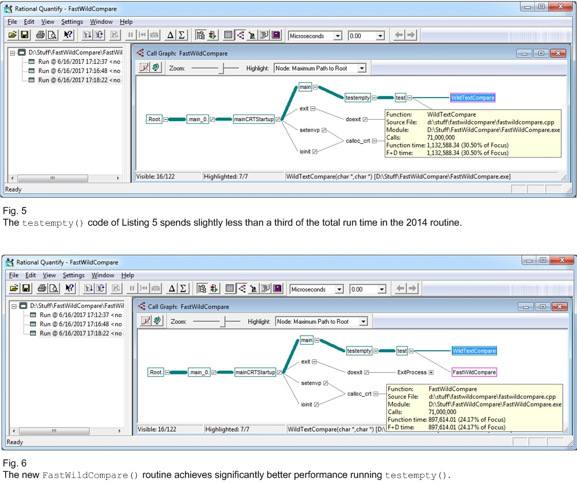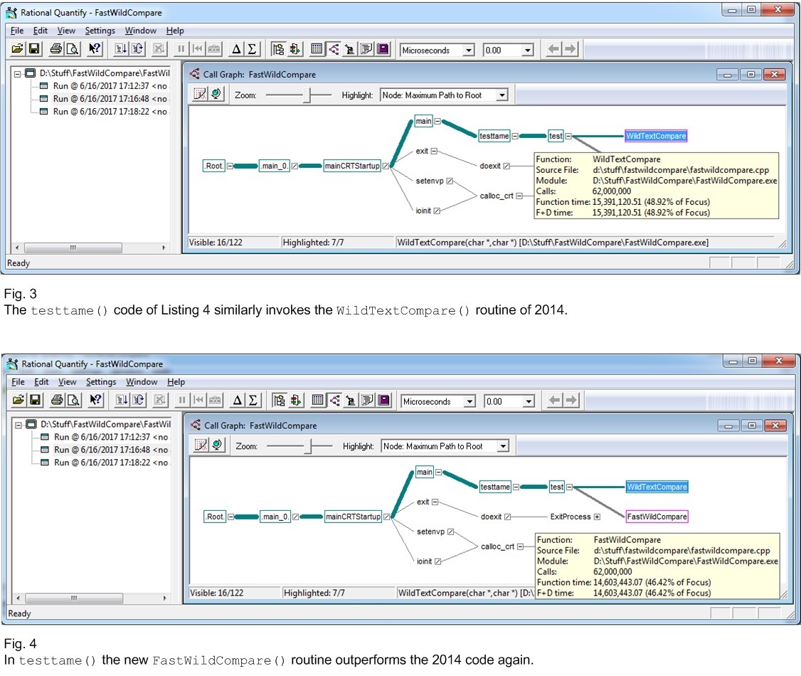 Figures 1 through 6 depict screenshots of three call graphs, with two figures per call graph. Each pair of figures reflects a performance improvement over my WildTextCompare() routine of 2014. In the first call graph, the testwild() code of Listing 3 is run in COMPARE_PERFORMANCE mode. This gets the code of Listing 1 to crunch all the wildcard test input for a million repetitions, along with the code of the 2014 routine, to compare the routines’ performance. Though the 2014 routine was optimized for wildcard comparison, the new FastWildCompare() routine comes in somewhat faster, thanks to the improved arrangement of special case logic.