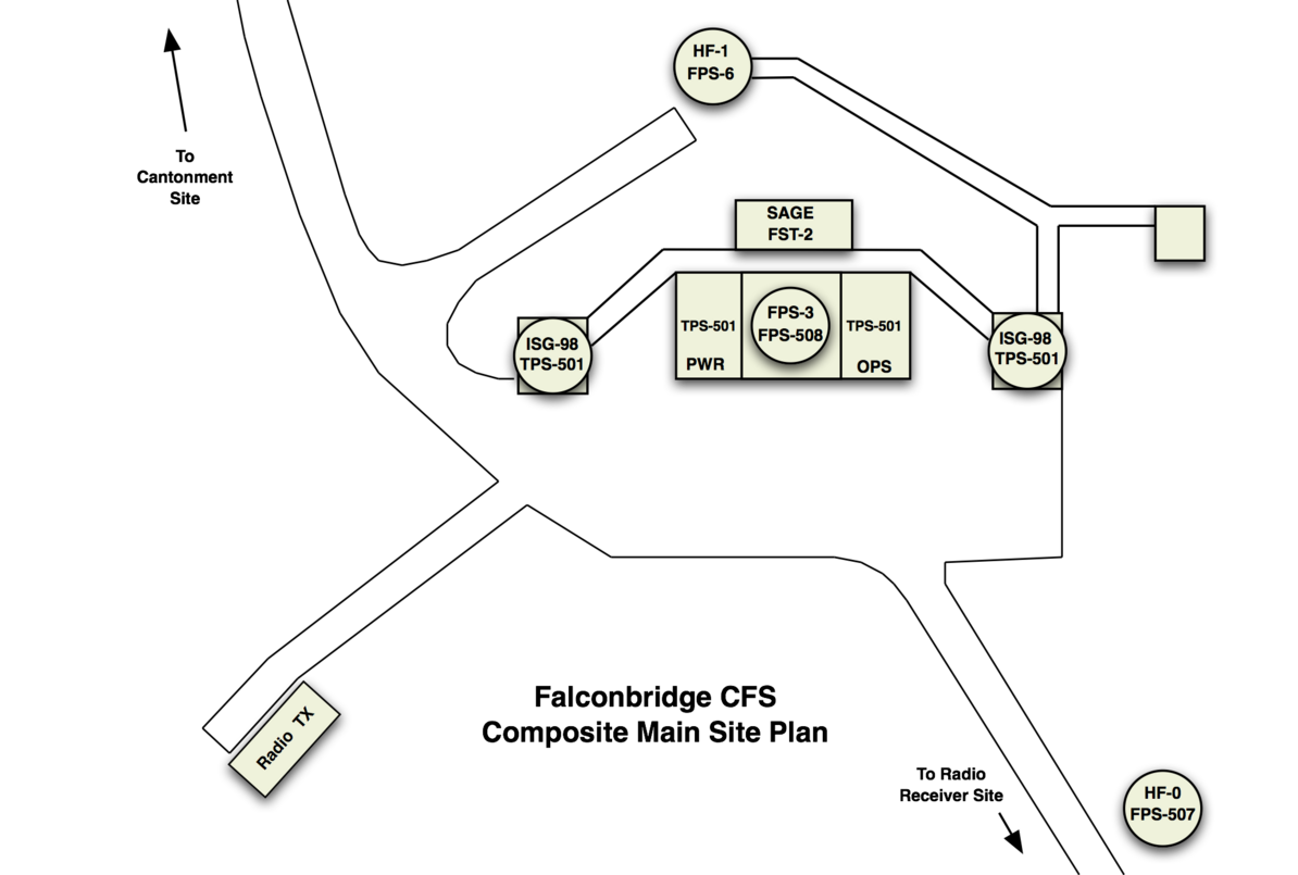 The station initially had both a Ground-Control Intercept (GCI) and early warning misssion. The early warning mission involved tracking and identifing all aircraft entering their airspace while the GCI mission involved guiding Air Force interceptors to any identified enemy aircraft. Controllers at the station vectored fighter aircraft at the correct course and speed to intercept enemy aircraft using voice commands via ground-to-air radio. The original configuration of radar equipment included one FPS-3 search radar and two ISG-98 height-finders. The FPS-3 was mounted atop the four-story main operations building and the two ISG-98 height-finders were mounted on two separate towers flanking the main building. The ISF-98 height-finder antennas were designed to rotate synchronously with the FPS-3 antenna providing two slant beams for height detection (they did not nod). Difficulties with the ISG-98 led to the installation of two TPS-501 height-finders on the sides of the main building. On 19 Jan 1956, the two ISG-98s were dismantled and one stored in each of the separate towers. The two TPS-501s were then moved from the main building onto the separate towers. The ISG-98s were shipped back to the depot on 4 Apr 1956. The height-finder saga continued with the installation of a separate FPS-6 height-finder tower and the acceptance of an FPS-6 height-finder radar on 5 Oct 1956. Blanking issues initially led to some problems but they were resolved. A second FPS-6 tower and radar sets were installed and the TPS-501s were removed. This second tower was completed with a radome on 8 Oct 1960 and the FPS-507 (Canadian version of FPS-6) was accepted on 2 Nov 1960. The FPS-3 search radar was modified, became an FPS-508 (Canadian version of FPS-20), and was accepted for service on 3 May 1960. On 6 Sep 1960 the Mark X IFF equipment was changed out for new the GPA-501 (SIF) equipment. With the changes implemented in 1960, the site radar equipment was prepared and configured for the coming SAGE System operation. SAGE SystemIn 1962 a SAGE Annex building was constructed at the rear of the main operations building and the FST-2B was installed in preparation for SAGE operation. In 1963 Falconbridge was declared SAGE System ready and the unit designation was changed to 33 Radar Squadron in 1964. As a SAGE radar site, the unit reported to the 23 NORAD Region in Duluth, Minnesota, Duluth SAGE Direction Center DC-10, but their data was also fed to the North Bay SAGE Direction Center DC-31. In March 1972, a detachment of the Air Weapons Control and Countermeasures School (AWC&CS) located in North Bay was established at Falconbridge CFS. The school taught the TQ-3 level Air Defence Technicians Course. With the SAGE System deactivation in 1983, the Falconbridge radar site became part of the Canada East ROCC, which was declared fully operational in August 1984. The Squadron was deactivated in December 1985 and the site closed on 1 Nov 1986.