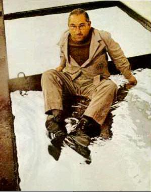 Of course, no one in their right mind, then or now, would expose themselves to this much mercury. But, man, doesn't it look like it would be an incredible experience? Mercury is so dense, and clings to itself so strongly, than the man floats on it like Styrofoam floats on water. The pressure inside a pool of mercury rises 13 times more rapidly than the pressure in a pool of water (because it is 13 times more dense). Imagine sticking your arm straight down into a pool of mercury: The pressure on your hand would be as high as if it were 20 feet under water. What must that feel like?