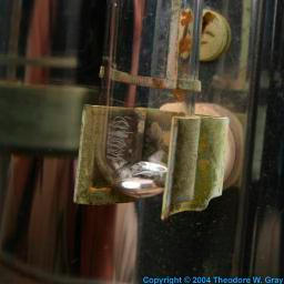 I replaced an old thermostat at our square house in Urbana, Illinois in late 2001, and this is the tilt switch from it. It had probably been there for decades. A thermostat works by mounting this kind of tilt switch on a coiled bi-metallic strip, which coils and uncoils slightly as the temperature changes. When the switch tilts out of level the mercury flows to one side or the other, turning on the heat or air-conditioning depending on the direction of tilt. The weight of the mercury tips the balance slightly further in the direction it went, providing a built-in hysteresis effect.