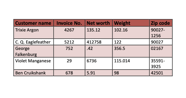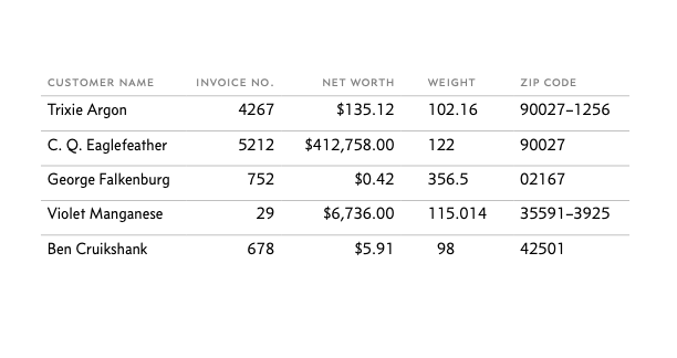 Net-worth values (quantities) have currency symbols, commas, and cents. Then they are aligned right, so cents and dollars line up. If a quantity is between 0 and 1, add a leading zero for clarity.