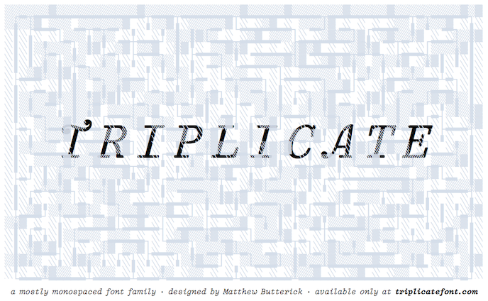 Triplicate is used for code samples and other monospaced typesetting in this book (e.g., one space between sentences). It’s also one of the fonts available for body text in this book. (Click on the font-selection toolbar at the bottom of the page to try it.)