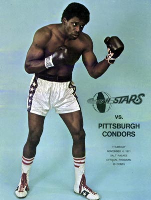 John Brisker had a justified reputation in the ABA for provoking fights and drawing serious blood. Early during the 1971-72 season, the Utah Stars visited the Pittsburgh Condors at the Civic Arena. The Stars' Willie Wise held Brisker to just four points in the first half. Brisker then scuffled with several Utah players, and tempers flared before the game was over. On November 4, 1971, the Condors visited Salt Lake City, and Stars' management arranged "John Brisker Intimidation Night." Ensign Ritchie explained it this way in that night's game program, which featured pro boxer Ron Lyle on the cover (above left): "Not that anyone on the Utah Stars team fears John Brisker. But just in case the husky, sometimes ill-tempered, Pittsburgh Condor forward gets out of line tonight the Stars' management has taken steps to keep all in control. Surrounding the court tonight will be five of the top boxers the Intermountain Area has ever produced. For tonight is 'John Brisker Intimidation Night' and it is the intention of the Stars to turn the tables on the high scoring Condor. Tonight it is Brisker who is on foreign soil and with the likes of Ron Lyle, Bill Daniels' professional boxer from Denver, Don and Gene Fullmer, Rex Layne and Tony Doyle standing in the wing, best he doesn't get far out of line." Brisker was wise enough not to provoke all of these boxers at once, but it was an interesting spectacle with the boxers lining the court, and Brisker behaving himself for once. |