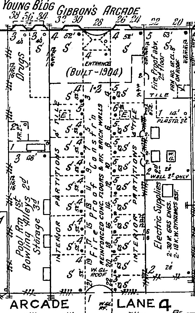 Figure 3: Sanborn Insurance Map with Details of Property Ownership in 1904. Jeffrey Guest, “Aspects of the Arcade.”