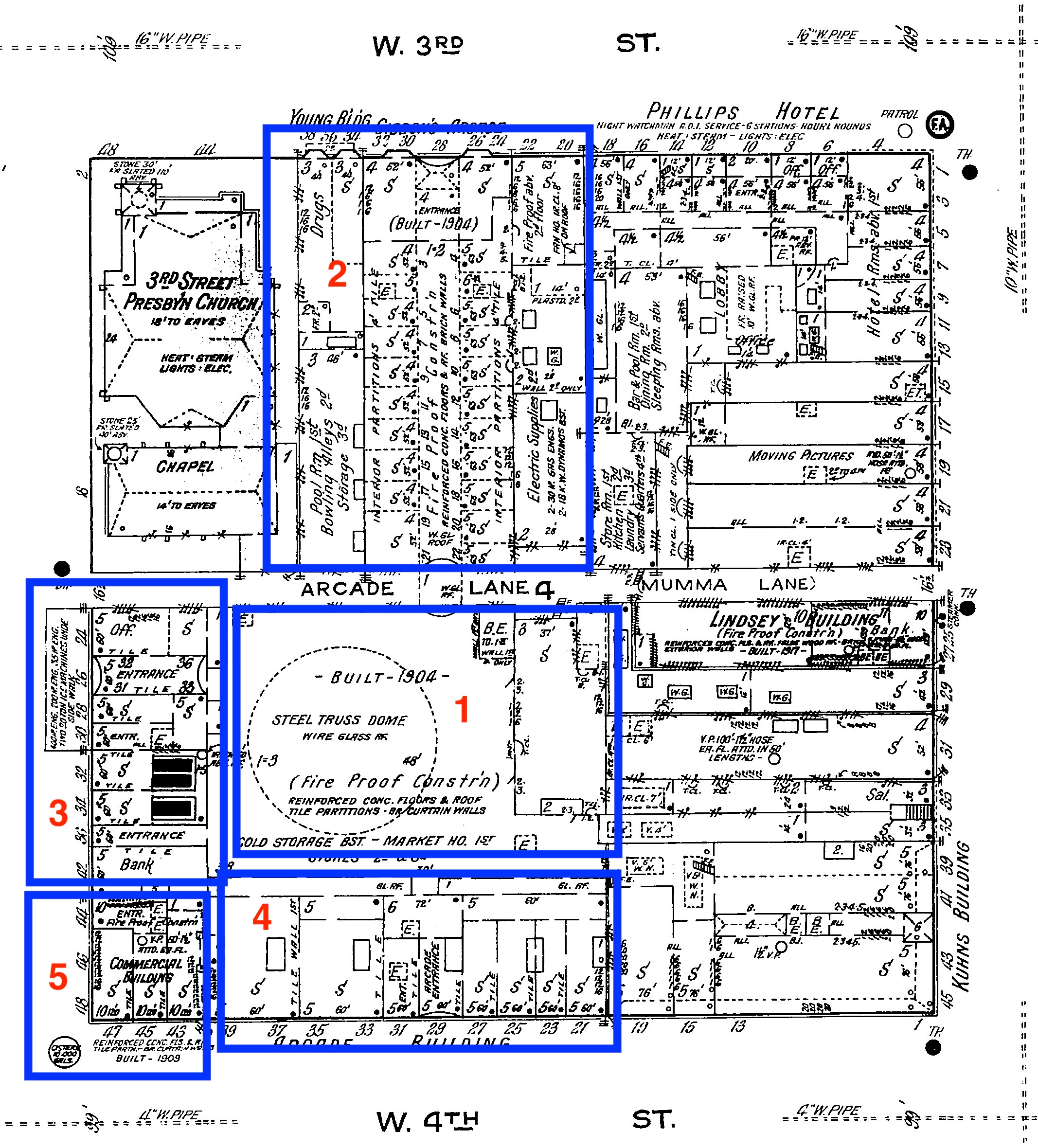 While the opening day was meant as a charity event, it would simultaneously establish the businesses of the Arcade in the local community. The architectural design of the Arcade was on full display to the many would-be customers, businesses, and renters who came for the charity event. Composed of four buildings that each had their own individual purposes, there was little about the Arcade architecture that was unimpressive.[21] Below are descriptions of each of the four original buildings, with the fifth building, the Commercial Building, being added in 1908.[22] The first of these indicated on the Sanborn Insurance Map from 1918 is the (1) Rotunda Market House. The second is the (2) Arcade itself. Buildings three and four are the (3) Ludlow and (4) Third Street Buildings. Finally, there is the (5) Commercial Building located at the corner of Ludlow and Fourth.
