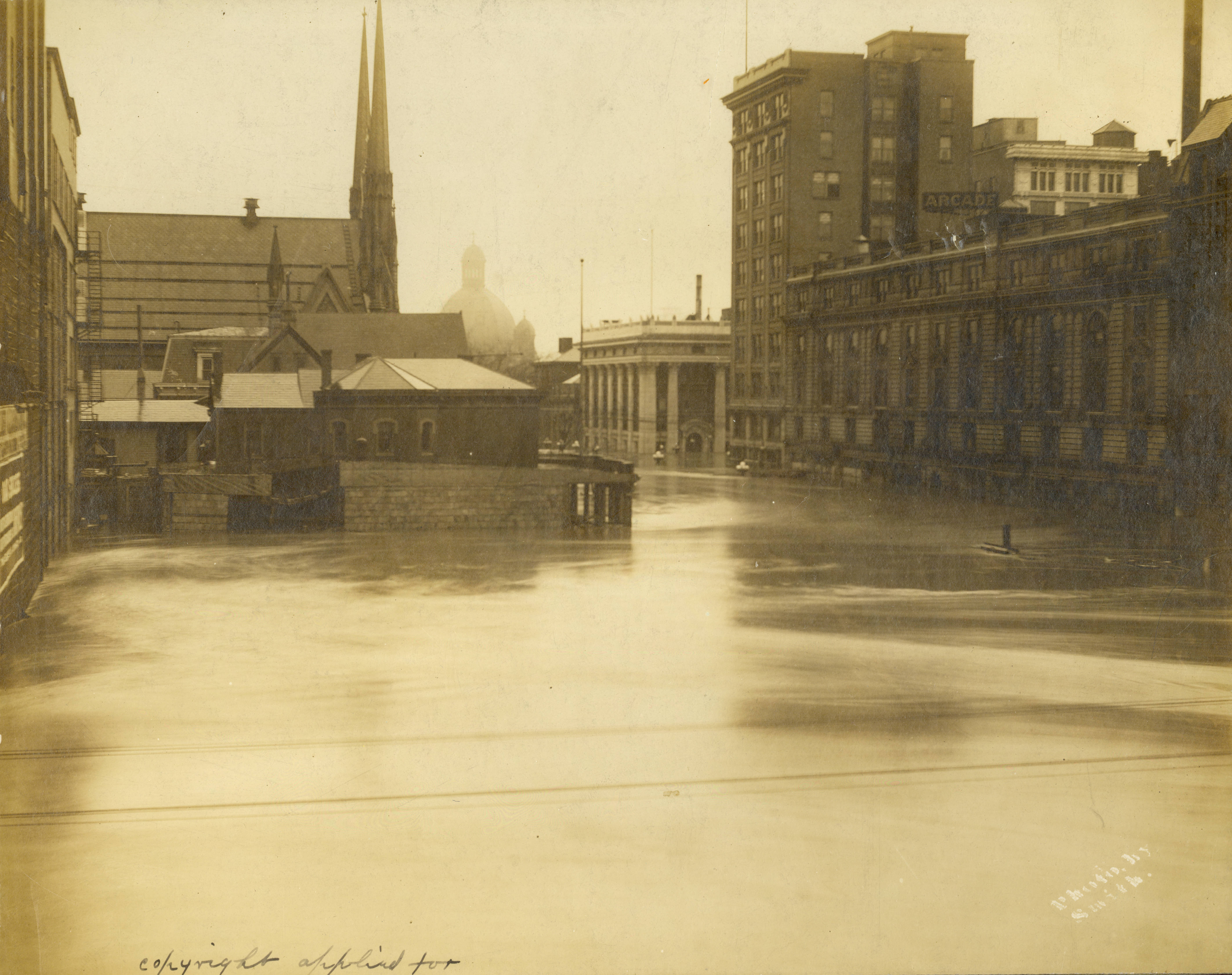 Photograph showing the Arcade’s famous Flemish Third Street entrance as the waters rises. Courtesy of Special Collections and Archives, Wright State University, Dayton, OH. Rikes Historical Collection.