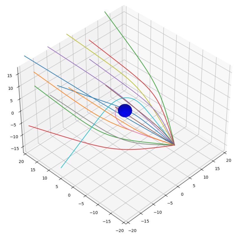 First, we need to understand that light does not always travel in a straight line, in fact, in the presence of mass/energy, light does not travel on a ‘straight’ path. This is because massive objects bend light around them. It’s just that at the scale we experience our everyday lives, the deflection of light is so insignificant that it is undetectable to the naked eye. Therefore, the approximation that light travels in a straight line in path tracing algorithms is excellent for all we usually want to render. However, for the astronomical scales of black holes and the proximity of light to the extreme space surrounding black holes, such an estimate falls short. Therefore, for raytracing a black hole, the main hurdle we find is the computation of the light path.