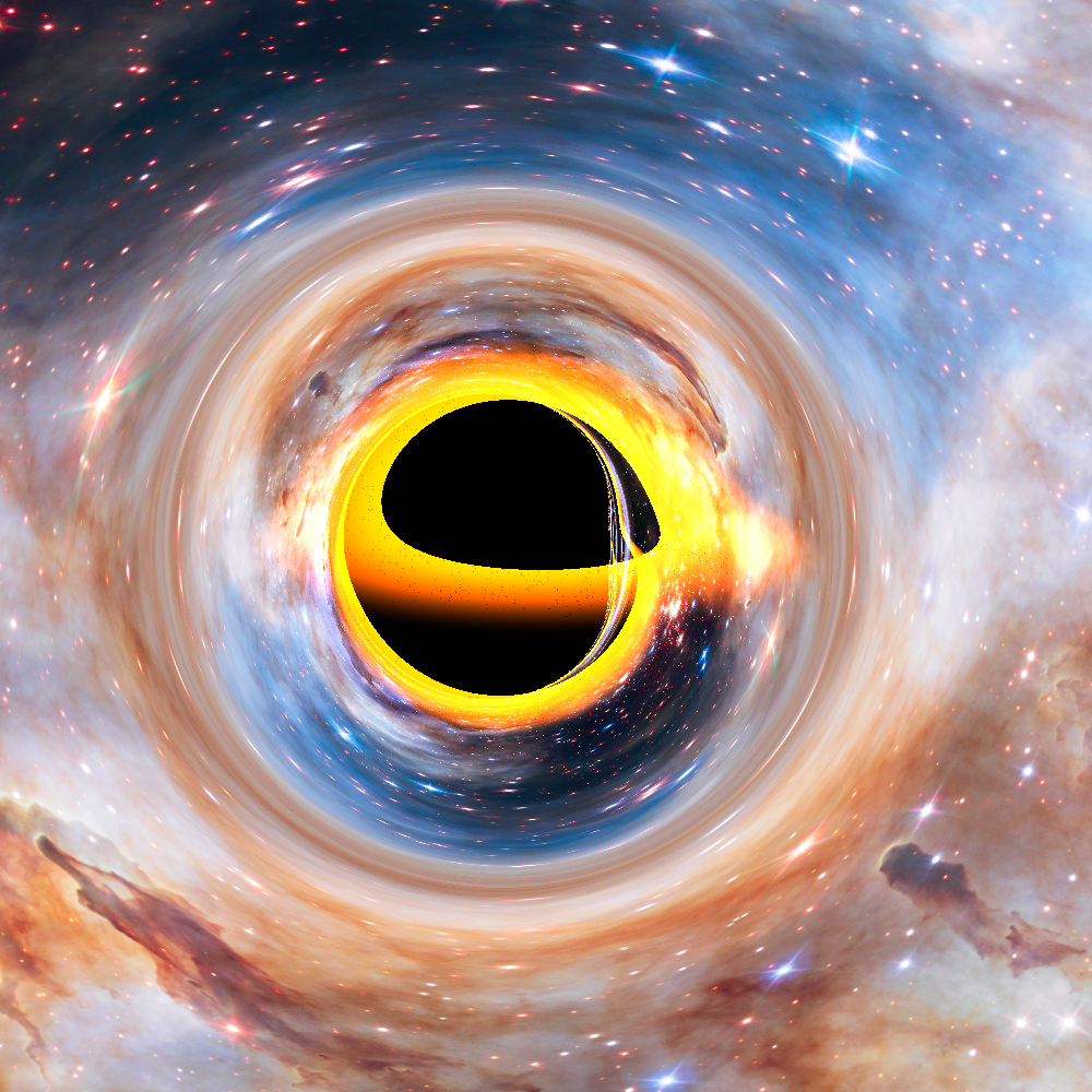 We can see that the black hole is just a black sphere, the halo is the accretion disk, and the background looks just like if you were to look at the sky. However, when we start raytracing the black hole with accurate general relativity, this is how it would look like: