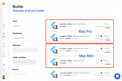 On Mac Pro, however, the Android Workflow took only 2m 23s, and the iOS Workflow took merely 1m 51s. And as they were running in parallel, the effective time for the build on Mac Pro is just 2m 23s.