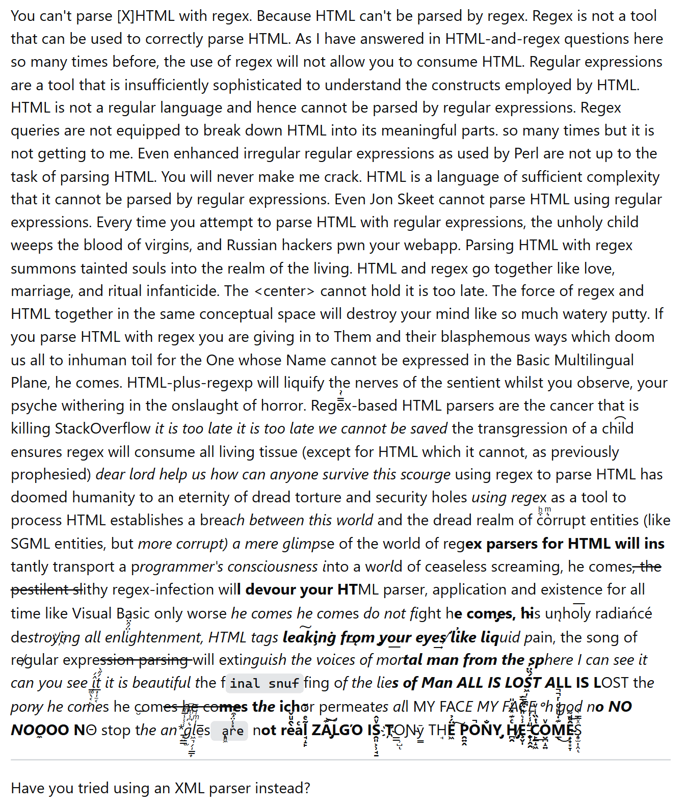 You can't parse [X]HTML with regex. Because HTML can't be parsed by regex. Regex is not a tool that can be used to correctly parse HTML. As I have answered in HTML-and-regex questions here so many times before, the use of regex will not allow you to consume HTML. Regular expressions are a tool that is insufficiently sophisticated to understand the constructs employed by HTML. HTML is not a regular language and hence cannot be parsed by regular expressions. Regex queries are not equipped to break down HTML into its meaningful parts. so many times but it is not getting to me. Even enhanced irregular regular expressions as used by Perl are not up to the task of parsing HTML. You will never make me crack. HTML is a language of sufficient complexity that it cannot be parsed by regular expressions. Even Jon Skeet cannot parse HTML using regular expressions. Every time you attempt to parse HTML with regular expressions, the unholy child weeps the blood of virgins, and Russian hackers pwn your webapp. Parsing HTML with regex summons tainted souls into the realm of the living. HTML and regex go together like love, marriage, and ritual infanticide. The <center> cannot hold it is too late. The force of regex and HTML together in the same conceptual space will destroy your mind like so much watery putty. If you parse HTML with regex you are giving in to Them and their blasphemous ways which doom us all to inhuman toil for the One whose Name cannot be expressed in the Basic Multilingual Plane, he comes. HTML-plus-regexp will liquify the nerves of the sentient whilst you observe, your psyche withering in the onslaught of horror. Rege̿̔̉x-based HTML parsers are the cancer that is killing StackOverflow it is too late it is too late we cannot be saved the transgression of a chi͡ld ensures regex will consume all living tissue (except for HTML which it cannot, as previously prophesied) dear lord help us how can anyone survive this scourge using regex to parse HTML has doomed humanity to an eternity of dread torture and security holes using regex as a tool to process HTML establishes a breach between this world and the dread realm of c͒ͪo͛ͫrrupt entities (like SGML entities, but more corrupt) a mere glimpse of the world of regex parsers for HTML will instantly transport a programmer's consciousness into a world of ceaseless screaming, he comes, the pestilent slithy regex-infection will devour your HTML parser, application and existence for all time like Visual Basic only worse he comes he comes do not fight he com̡e̶s, ̕h̵is un̨ho͞ly radiańcé destro҉ying all enli̍̈́̂̈́ghtenment, HTML tags lea͠ki̧n͘g fr̶ǫm ̡yo͟ur eye͢s̸ ̛l̕ik͏e liquid pain, the song of re̸gular expression parsing will extinguish the voices of mortal man from the sphere I can see it can you see ̲͚̖͔̙î̩́t̲͎̩̱͔́̋̀ it is beautiful the final snuffing of the lies of Man ALL IS LOŚ͖̩͇̗̪̏̈́T ALL IS LOST the pon̷y he comes he c̶̮omes he comes the ichor permeates all MY FACE MY FACE ᵒh god no NO NOO̼OO NΘ stop the an*̶͑̾̾̅ͫ͏̙̤g͇̫͛͆̾ͫ̑͆l͖͉̗̩̳̟̍ͫͥͨe̠̅s͎a̧͈͖r̽̾̈́͒͑enot rè̑ͧ̌aͨl̘̝̙̃ͤ͂̾̆ ZA̡͊͠͝LGΌ ISͮ̂҉̯͈͕̹̘̱ TO͇̹̺ͅƝ̴ȳ̳ TH̘Ë͖́̉ ͠P̯͍̭O̚N̐Y̡ H̸̡̪̯ͨ͊̽̅̾̎Ȩ̬̩̾͛ͪ̈́̀́͘ ̶̧̨̱̹̭̯ͧ̾ͬC̷̙̲̝͖ͭ̏ͥͮ͟Oͮ͏̮̪̝͍M̲̖͊̒ͪͩͬ̚̚͜Ȇ̴̟̟͙̞ͩ͌͝S̨̥̫͎̭ͯ̿̔̀ͅ