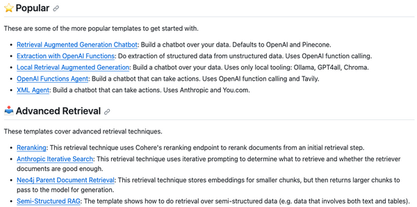 In response to the above, we began working on LangChain Templates. LangChain Templates offers a collection of easily deployable reference architectures that anyone can use. We have created a collection of end-to-end templates for creating different types of applications. These templates are in a standard format that makes them easy to deploy with LangServe. We've also exposed an easy way to create new projects and load templates in.