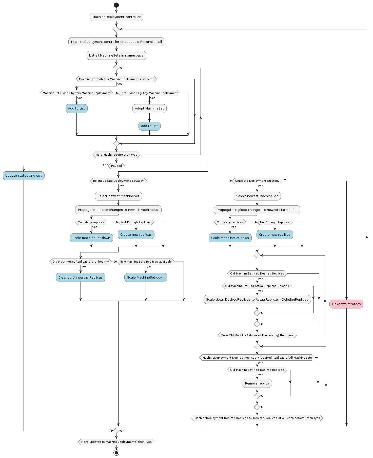 A MachineDeployment orchestrates deployments over a fleet of MachineSets.