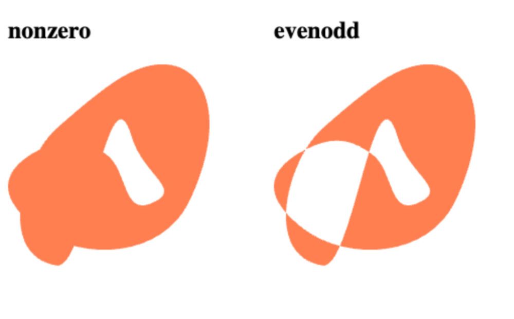 nonzero(default): The browser picks a point and draws a ray (a straight line) out of the shape. The browser also sets a direction along the shape’s path (basically, if it were being drawn, it chooses a direction the pen is moving in to complete the shape). It doesn’t really matter where it starts or which direction it begins in because the algorithm only cares about the ray crossing paths that move (or are drawn in) opposite directions. When the ray crosses part of the shape’s path, the browser increments or decrements a counter. If the ray crosses a part of the path moving in a clockwise direction, the browser increments; if the path is moving counterclockwise, the browser decrements. When the resulting counter is not zero, the point is inside the shape and within the fill. If the counter is zero, the point is outside.evenodd: The browser picks a point and draws a ray (a straight line) from that point out of the shape (it does not care about the direction of the shape’s path). Every time the ray crosses a path of the shape it increments a counter. If the counter ends as an odd number, the point is considered inside the shape and within the fill. If the counter is even, the point is outside the shape.