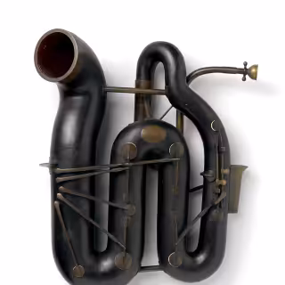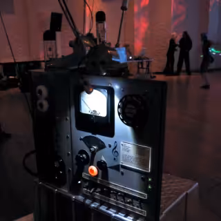 Wherein a tartan shopping jeep is employed to project a homespun Snake video game across the back wall, biofeedback via an earring and iPad is presented, and heating‑coil glass instruments are displayed.
