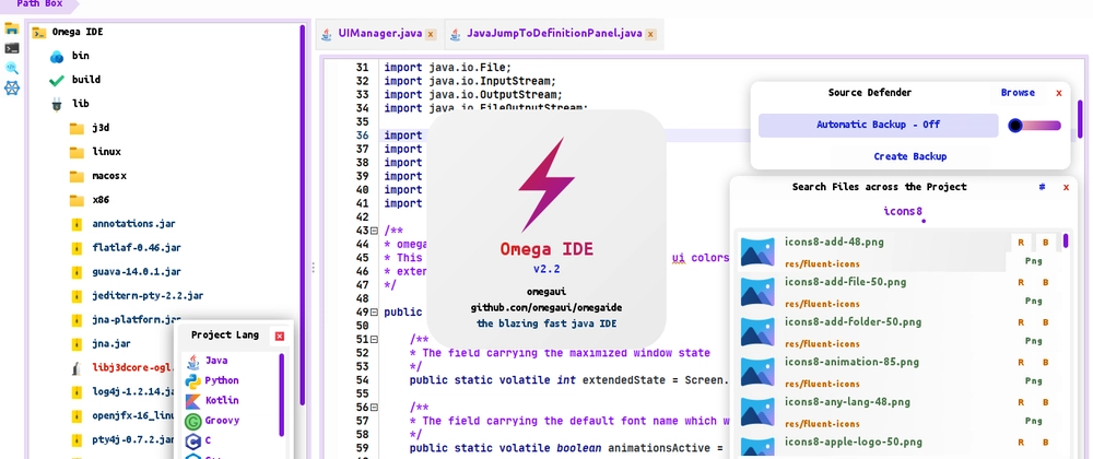 The IDE currently can behave both as a fully integrated java IDE and as an instant IDE for editing, compiling and running any other programming language.