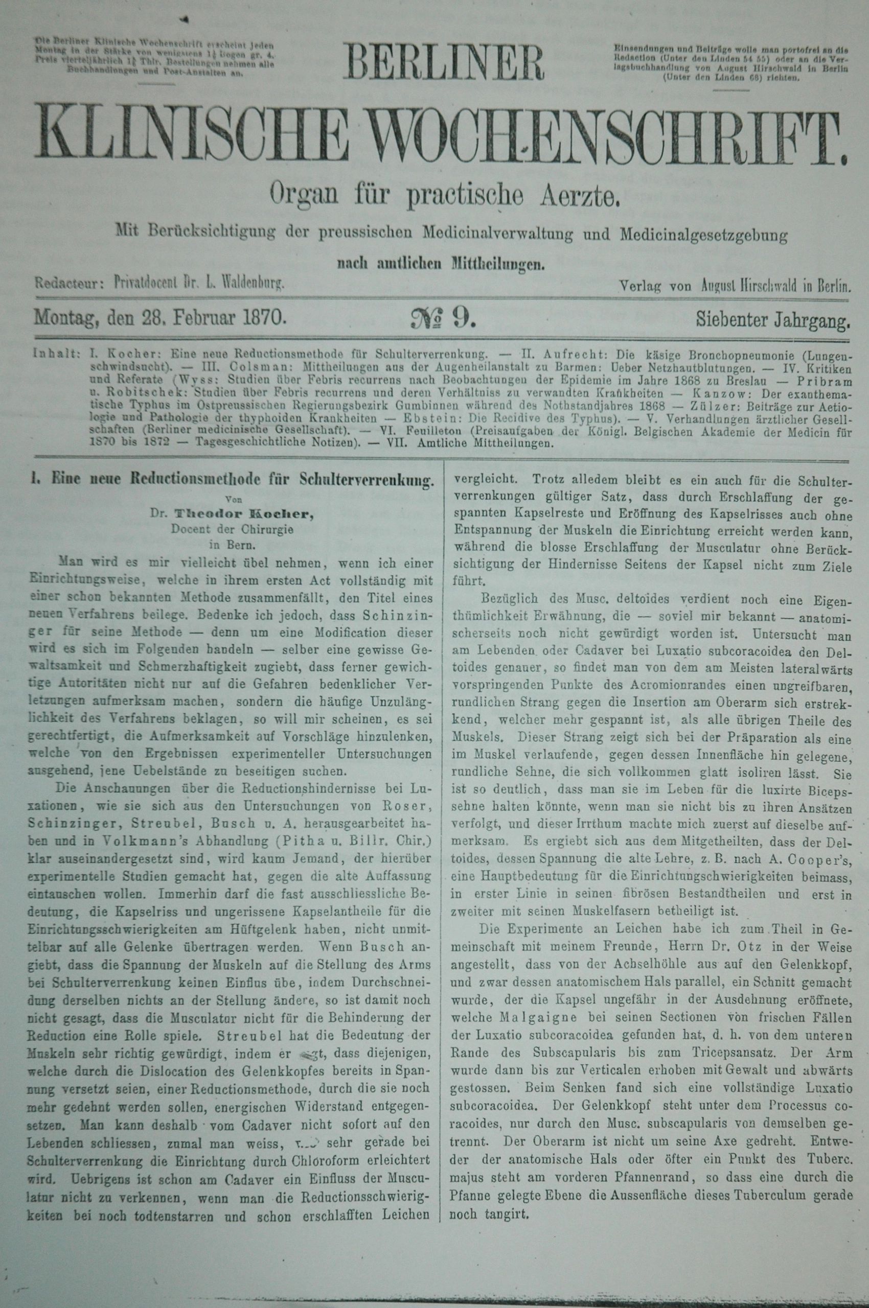 Kocher, Theodor: “Eine neue Reductionsmethode für Schulterverrenkung“,Berliner Klinische Wochenschrift, vol 7, issue 9, 28 Feb 1870, 101-105.