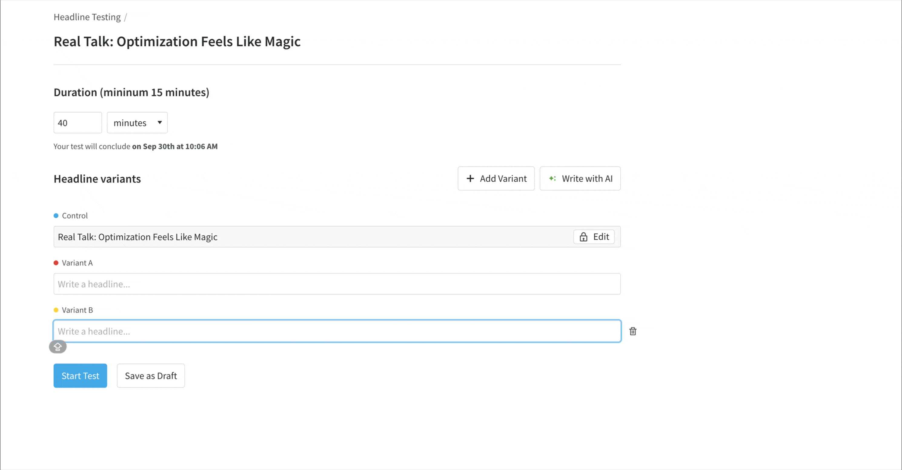 Define how long the test should run, anywhere from 15 minutes up to 7 days. - Add headline variants.