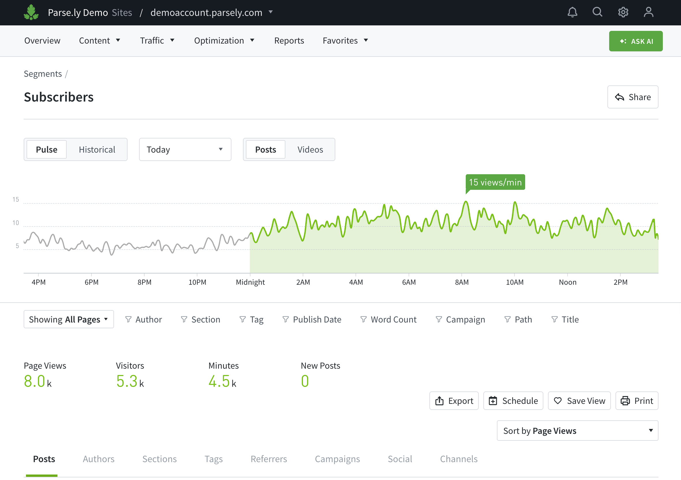Segments are available at an additional cost. Some types of segments require a small change to your Parse.ly integration — details are available in Parse.ly’s technical documentation. Contact your Relationship Manager for more information on pricing and functionality.