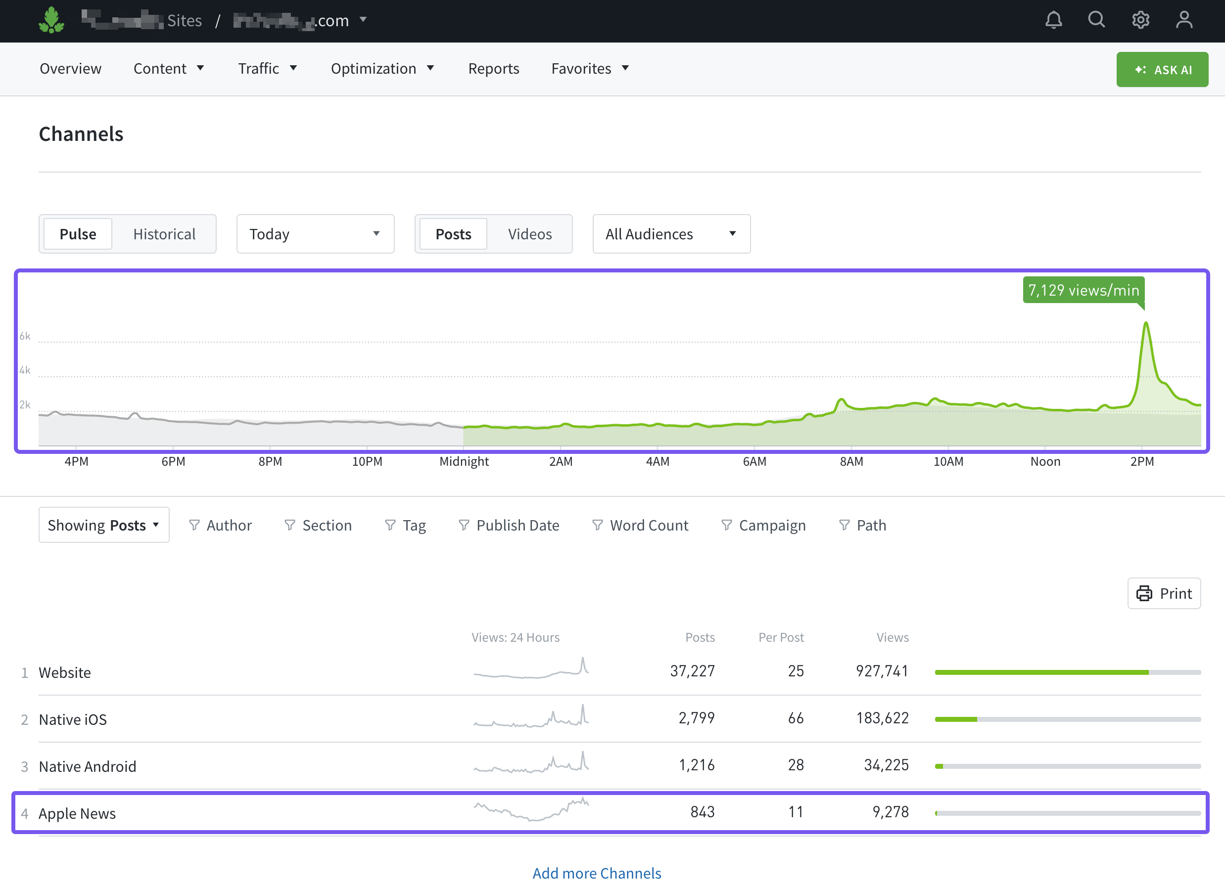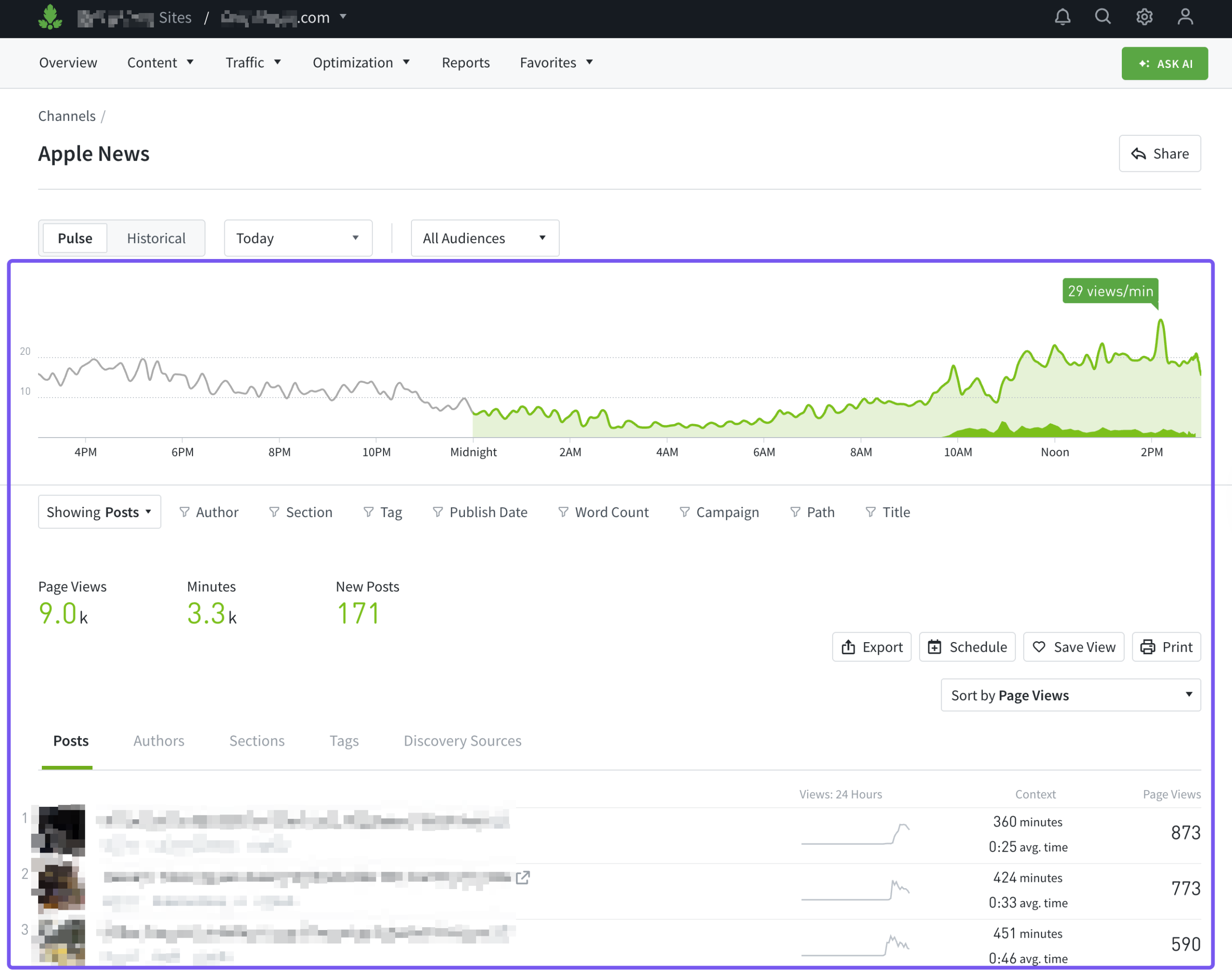 APLN data affects virtually everything on Overview, including Post Views, Minutes, Avg. Time, and New Posts (note that new posts are deduplicated, so if you have the same article on the website and on Apple News, that only equals one new post).