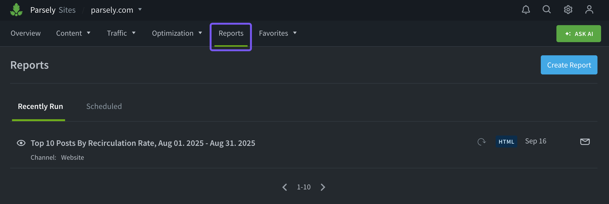 Parse.ly offers metrics reports that you can generate once or on a recurring basis. To start, navigate to the Reports tab of the Parse.ly Dashboard.