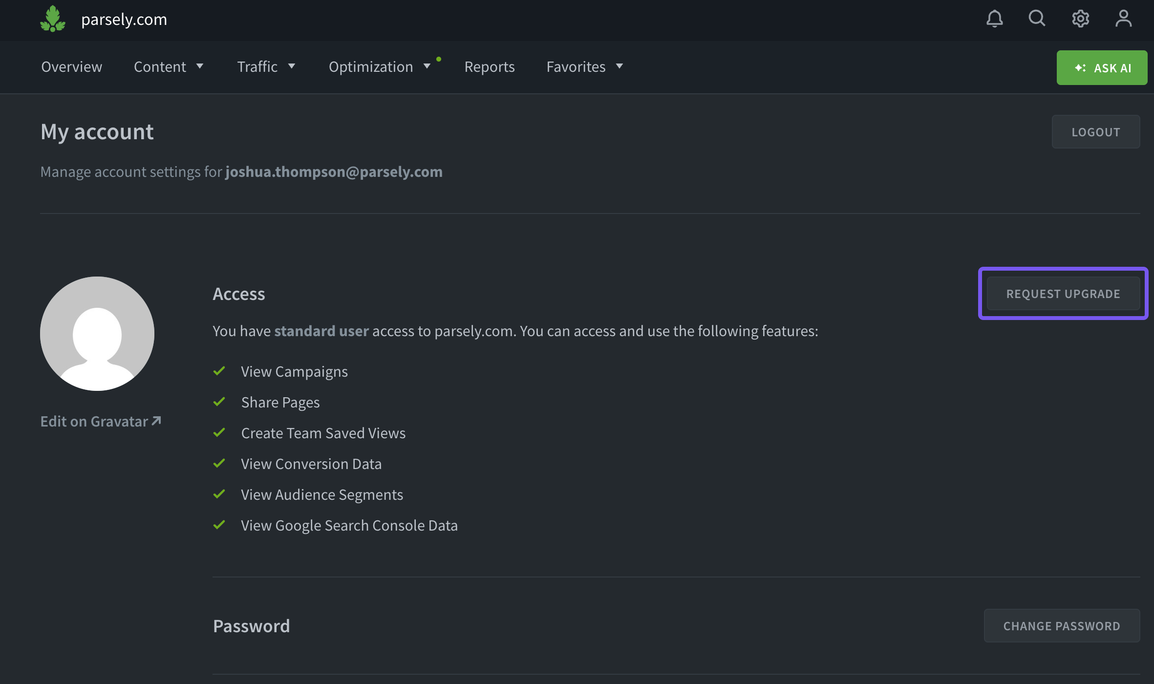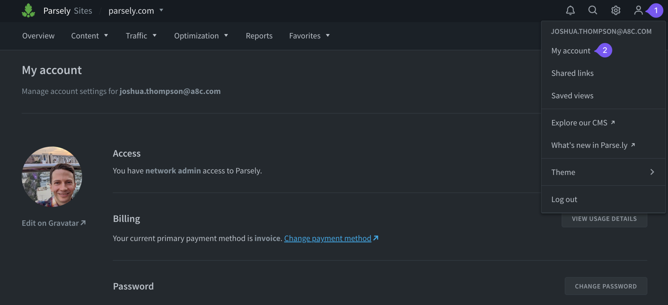 The user options menu in the top bar of the Parse.ly Dashboard provides access to the account settings page. Click the “My account” menu option to see the account settings page.