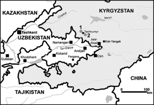 Field work in Kyrgyzstan in 2000–03 was carried out in cooperation with the M. M. Adyshev Institute of Geology of the National Academy of Sciences of the Kyrgyz Republic. The director of this institute, Prof. Apas A. Bakirov (Bishkek) is thanked for his support. We are grateful to three anonymous reviewers for constructional criticism on our paper. This project was funded by the Deutsche Forschungsgemeinschaft (DFG) (Ma 1643/8-1-2 and 436 RUS 113/602/0-1. The work of TM additionally was supported by a Heisenberg grant (DFG) and the work of AA by a Russian Fund of Basic Research (RFBR) grant 04-04-49113 and President’s of Russia grant MD-255.2003.04.