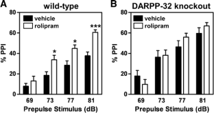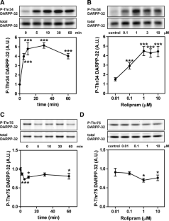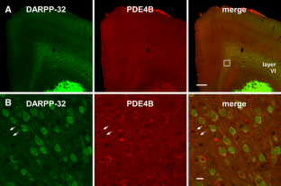 Inhibition of PDE4 by rolipram induced activation of cAMP/PKA signaling in cortical slices and in vivo, leading to the phosphorylation of DARPP-32 and other postsynaptic and presynaptic PKA-substrates. Rolipram also enhanced DARPP-32 phosphorylation invoked by D1 receptor activation. Immunohistochemical studies demonstrated PDE4A, PDE4B, and PDE4D expression in DARPP-32-positive neurons in layer VI of frontal cortex, most likely in D1 receptor-positive, glutamatergic corticothalamic pyramidal neurons. Furthermore, the ability of rolipram treatment to improve the performance of mice in a sensorimotor gating test was DARPP-32-dependent.