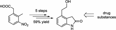 This paper describes a practical approach to the preparation of 4-(2-hydroxyethyl)indolin-2-one, a key intermediate in the synthesis of dopaminergic agonists such as ropinirole—a drug used in the treatment of Parkinson’s disease and restless legs syndrome—and of two sets of protein kinase inhibitors. The sequence starts from commercially available 2-(2-methyl-3-nitrophenyl)acetic acid, which is converted in five steps into the desired target compound. This procedure offers a convenient alternative route to existing methodologies, given its milder reaction conditions, ease of implementation, and its overall yield (59 %).