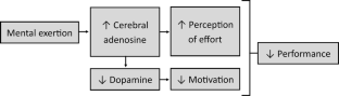Mental fatigue reflects a change in psychobiological state, caused by prolonged periods of demanding cognitive activity. It has been well documented that mental fatigue impairs cognitive performance; however, more recently, it has been demonstrated that endurance performance is also impaired by mental fatigue. The mechanism behind the detrimental effect of mental fatigue on endurance performance is poorly understood. Variables traditionally believed to limit endurance performance, such as heart rate, lactate accumulation and neuromuscular function, are unaffected by mental fatigue. Rather, it has been suggested that the negative impact of mental fatigue on endurance performance is primarily mediated by the greater perception of effort experienced by mentally fatigued participants. Pageaux et al. (Eur J Appl Physiol 114(5):1095–1105, 2014) first proposed that prolonged performance of a demanding cognitive task increases cerebral adenosine accumulation and that this accumulation may lead to the higher perception of effort experienced during subsequent endurance performance. This theoretical review looks at evidence to support and extend this hypothesis.