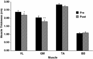 The aim of the present study was to investigate the changes in thickness, fascicle length (L f) and pennation angle (θ) of the antigravity gastrocnemius medialis (GM) and vastus lateralis (VL) muscles, and the non-antigravity tibialis anterior (TA) and biceps brachii (BB) muscles measured by ultrasonography in ten healthy males (aged 22.3 ± 2.2 years) in response to 5 weeks of horizontal bed rest (BR). After BR, muscle thickness decreased by 12.2 ± 8.8% (P < 0.05) and 8.0 ± 9.1% (P < 0.005) in the GM and VL, respectively. No changes were observed in the TA and BB muscles. L f and θ decreased by 4.8 ± 5.0% (P < 0.05) and 14.3 ± 6.8% (P < 0.005) in the GM and by 5.9 ± 5.3% (P < 0.05) and 13.5 ± 16.2% (P < 0.005) in the VL, again without any changes in the TA and BB muscles. The finding that amongst the antigravity muscles of the lower limbs, the GM deteriorated to a greater extent than the VL is possibly related to the differences in relative load that this muscle normally experiences during daily loading. The dissimilar response in antigravity and non-antigravity muscles to unloading likely reflects differences in loading under normal conditions. The significant structural alterations of the GM and VL muscles highlight the rapid remodelling of muscle architecture occurring with disuse.