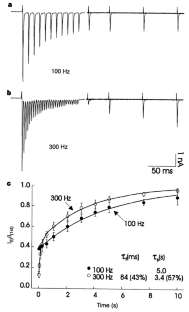 Synapses in the central nervous system undergo various short- and long-term changes in their strength1,2,3, but it is often difficult to distinguish whether presynaptic or postsynaptic mechanisms are responsible for these changes. Using patch-clamp recording from giant synapses in the mouse auditory brainstem4,5,6,7, we show here that short-term synaptic depression can be largely attributed to rapid depletion of a readily releasable pool of vesicles. Replenishment of this pool is highly dependent on the recent history of synaptic activity. High-frequency stimulation of presynaptic terminals significantly enhances the rate of replenishment. Broadening the presynaptic action potential with the potassium-channel blocker tetraethylammonium, which increases Ca2+ entry, further enhances the rate of replenishment. As this increase can be suppressed by the Ca2+-channel blocker Cd2+ or by the Ca2+ buffer EGTA, we conclude that Ca2+ influx through voltage-gated Ca2+ channels is the key signal that dynamically regulates the refilling of the releasable pool of synaptic vesicles in response to different patterns of inputs.