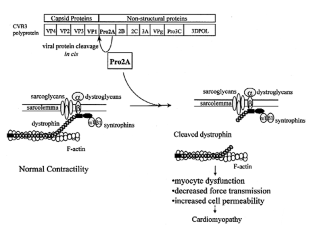 Enteroviruses such as Coxsackievirus B3 can cause dilated cardiomyopathy, but the mechanism of this pathology is unknown. Mutations in cytoskeletal proteins such as dystrophin cause hereditary dilated cardiomyopathy, but it is unclear if similar mechanisms underlie acquired forms of heart failure. We demonstrate here that purified Coxsackievirus protease 2A cleaves dystrophin in vitro as predicted by computer analysis. Dystrophin is also cleaved during Coxsackievirus infection of cultured myocytes and in infected mouse hearts, leading to impaired dystrophin function. In vivo, dystrophin and the dystrophin-associated glycoproteins α-sarcoglycan and β-dystroglycan are morphologically disrupted in infected myocytes. We suggest a molecular mechanism through which enteroviral infection contributes to the pathogenesis of acquired forms of dilated cardiomyopathy.