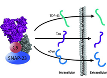 These data illuminate a non‐canonical pathway to extracellular release mediated by a SNAP23‐dependent mechanism, suggesting a novel route for the release of tau from the neuron. SNARE proteins coordinate vesicle trafficking and exocytosis in all cells (Morelli et al, 2014; Rogers et al, 2014; Dubuke et al, 2015; Kuster et al, 2015; Zhu et al, 2015), and chaperones play an important role in several of these processes (Joglekar & Hay, 2005; Sharma et al, 2011). This has a number of important implications for understanding the propagation of pathological protein aggregates found in several neurodegenerative diseases. SNAP‐23 expression is critical for survival (Suh et al, 2011; Kaul et al, 2015), and found highly expressed in several tissues and both neuronal and non‐neuronal cells (Grant et al, 1999; Delgado‐Martínez et al, 2007; Mandolesi et al, 2009). While highly analogous to SNAP‐25, the SNARE involved in classical neurotransmitter release, SNAP‐23 is unique in that it cannot completely rescue SNAP‐25 release function in null mice and is not restricted to the synaptic active zone (Delgado‐Martínez et al, 2007). Thus, it is possible that extracellular protein release via a SNAP‐23 may arise in response to overwhelming protein burden of aggregation‐prone proteins. Hsc70 is known to direct neurodegenerative clients for degradation by both proteasomal and lysosomal mechanisms. In multicellular organisms, senescent cells in particular sequester misfolded protein aggregates for lysosomal‐mediated degradation. This pathway may become problematic if lysosome function becomes compromised (Fornai et al, 2008; Poehler et al, 2014; Bae et al, 2015) or the protein burden is too high, activating a non‐conventional secretion process, such as lysosomal exocytosis, or secretory autophagy (“exophagy”) (Broadwell & Balin, 1985; Ejlerskov et al, 2013). This release may be used as a mechanism of last resort to eject toxic multimers for processing by phagocytic cells. Over time, this degradation pathway itself may become overwhelmed, which then facilitates propagation of these disease proteins through both neurons and glial cells in the brain (Asai et al, 2015; Pearce et al, 2015).